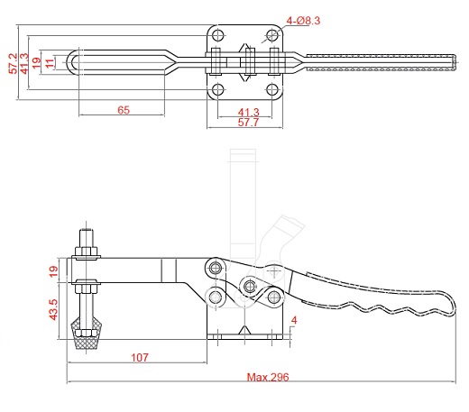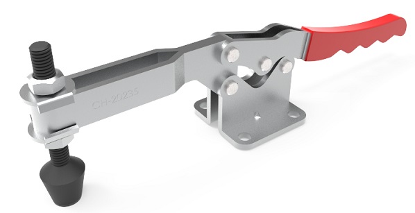 Bloccaggio orizzontale - base piatta - braccio regolabile - portata 350 Kg. - Articolo Clamptek CH-20235. Sfruttando le caratteristiche geometriche e i vantaggi meccanici, Il meccanismo a leva, amplifica la bassa forza imputata dall’operatore in un’elevata capacità di serraggio.Per realizzare questo, è necessario posizionare il bloccaggio al di sopra del proprio asse principale. Viene così garantita un’ottima tenuta e impedita l’apertura durante il lavoro.Queste caratteristiche rendono i bloccaggi a leva adatti a numerose applicazioni specialmente in operazioni ripetitive.L'intera gamma presenta un design della struttura e un'impugnatura ergonomica, che permettono un'elevata funzionalità.