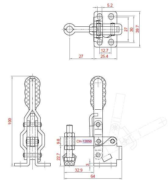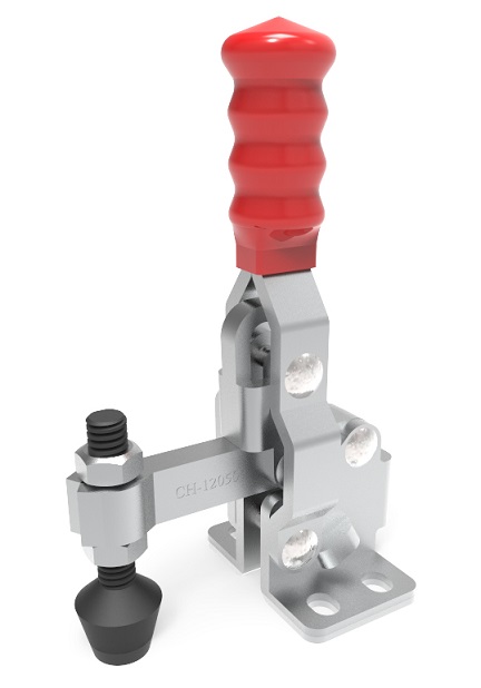 Bloccaggio verticale - base piatta - braccio fisso - portata 90 Kg. - Articolo Clamptek CH-12050. Sfruttando le caratteristiche geometriche e i vantaggi meccanici, Il meccanismo a leva, amplifica la bassa forza imputata dall’operatore in un’elevata capacità di serraggio. Per realizzare questo, è necessario posizionare il bloccaggio al di sopra del proprio asse principale. Viene così garantita un’ottima tenuta e impedita l’apertura durante il lavoro.Queste caratteristiche rendono i bloccaggi a leva adatti a numerose applicazioni specialmente in operazioni ripetitive.L'intera gamma presenta un design della struttura e un'impugnatura ergonomica, che permettono un'elevata funzionalità.