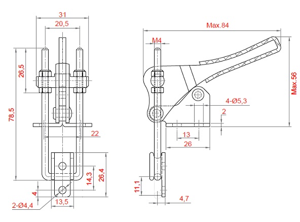 Bloccaggio a tirante - base piatta - versione verticale - portata 230 Kg. - Articolo Clamptek CH-40324-SS - VERSIONE INOX.