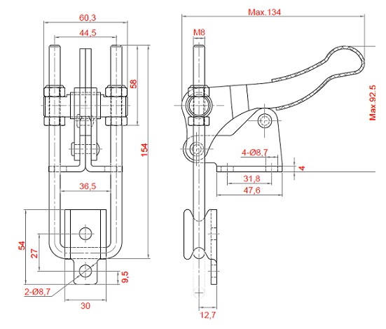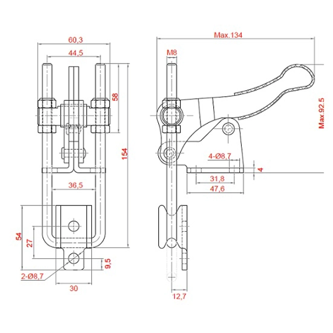 Bloccaggio a tirante - base piatta - versione verticale - portata 920 Kg. - Articolo Clamptek CH-40344-SS - VERSIONE INOX.