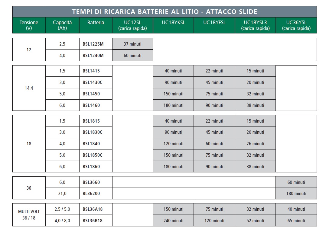 Esempi di tempi di ricaricaBatteria da 14,4V/18V - 1,5 Ah = 15 minuti Batteria da 14,4V/18V - 3,0 Ah = 20 minuti Batteria da 14,4V/18V - 5,0 Ah = 32 minuti Batteria Multivolt 36V/18V - BSL36A18 = 32 minuti Batteria Multivolt 36V/18V - BSL36B18 = 52 minuti Vedere schema allegato per i tempi di ricarica.