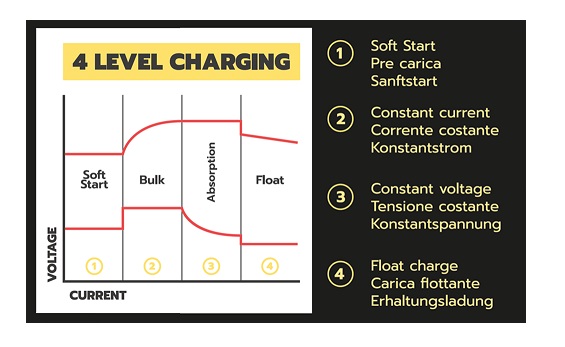 Il DISCOVERY 60 è controllato da microprocessore e presenta 4 stadi di carica, adatti alla carica di batterie per automobili, moto, motoslitte, trattori, barche,…. Il microprocessore ha la funzione di verificare le condizioni della batteria e generare la corrente e tensione di carica corrette per la batteria (caratteristiche di carica). Questo darà la carica migliore e la vita più lunga alla batteria.