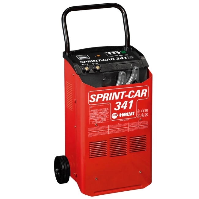 Carica batteria SPRINT CAR 341 - art.99010046. Carica batterie professionale con avviamento. Carrellato. Selettore per la corrente di carica lenta o veloce. Amperometro, protezione termostatica contro gli avviamenti prolungati. Fusibile interno contro corto circuiti ed inversione di polarità.