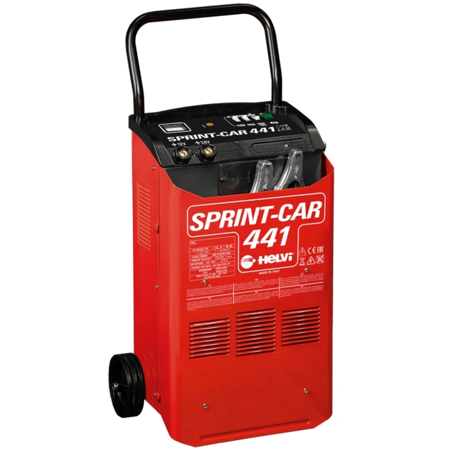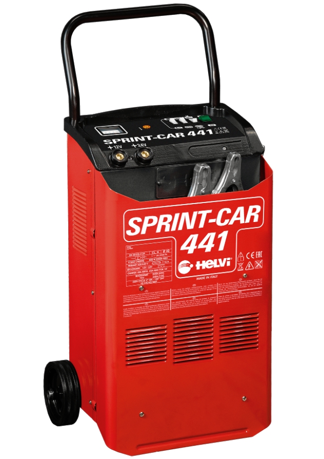 Carica batteria SPRINT CAR 441 - art.99010047. Carica batterie professionale con avviamento. Carrellato. Selettore per la corrente di carica lenta o veloce. Amperometro, protezione termostatica contro gli avviamenti prolungati. Fusibile interno contro corto circuiti ed inversione di polarità.