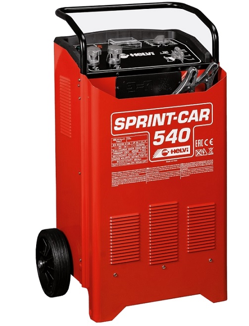 Carica batteria SPRINT CAR 540 - art.99010041. Carica batterie professionale con avviamento. Carrellato. Selettore per la corrente di carica lenta o veloce. Amperometro, protezione termostatica contro gli avviamenti prolungati. Fusibile interno contro corto circuiti ed inversione di polarità.