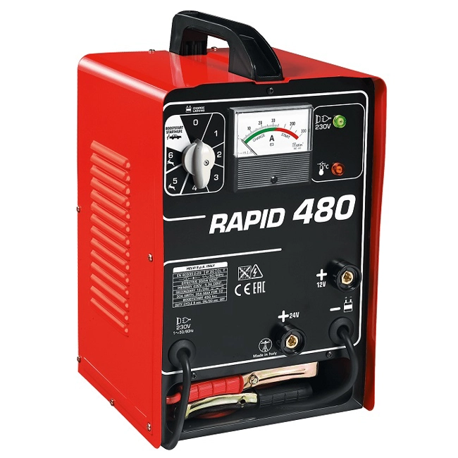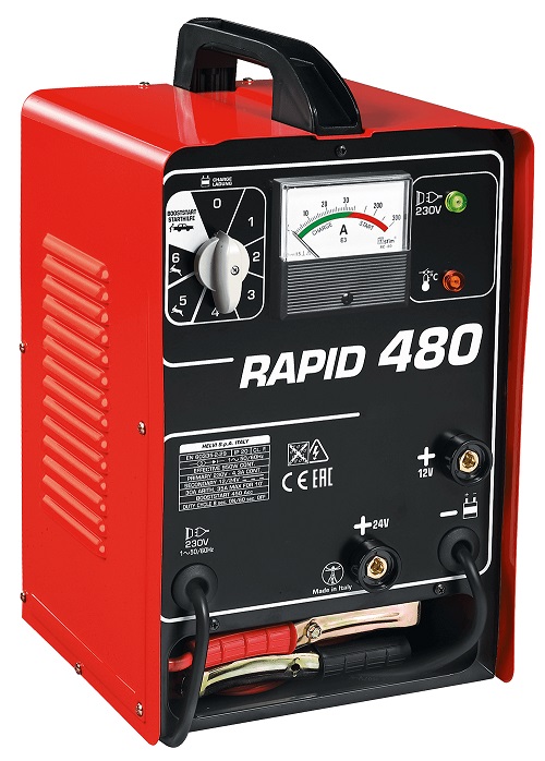 Carica batteria Rapid 480 - art.99005053. Carica batterie con avviamento. Selettore per la corrente di carica. Amperometro, protezione termostatica contro gli avviamenti prolungati. Fusibile interno contro corto circuiti ed inversione di polarità.