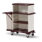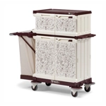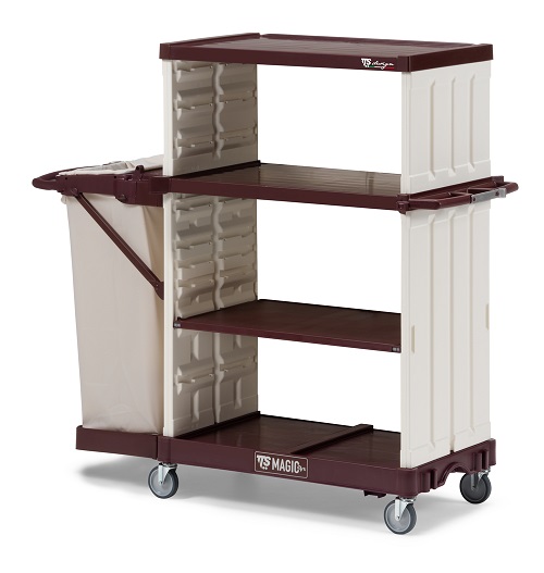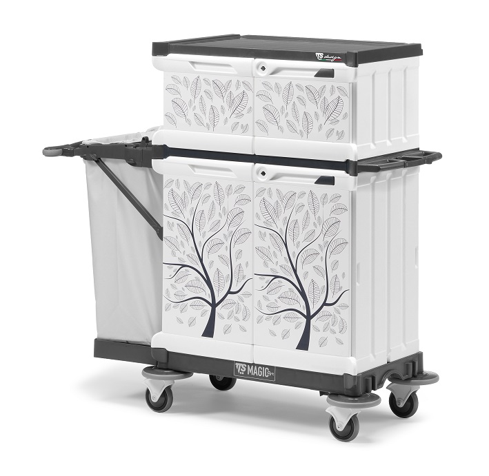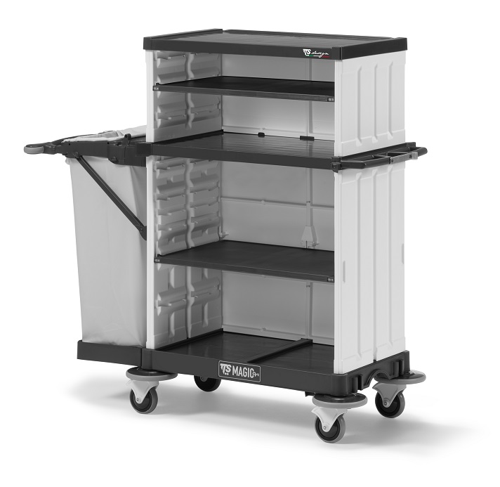 Carrello alberghiero Magic Art 26 Pick & Go.Carrello multiuso in polipropilene ad alta capienza modulare e accessoriabile per rispondere ad ogni esigenza di pulizia.Ideale per il riassetto in strutture medio-piccole con problemi di spazio grazie al portasacco compattabile.