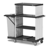 Modelli M265R99C01000 -M265T99C01000:Ripiano grande estraibile 79x46,5 cm.Ripiano fisso grande senza corsia centrale.Portasacco pieghevole 120 L SX senza paracolpi (SACCO NON IN DOTAZIONE).Base grande, 91x52 cm, con ruote in gomma ø 125 mm senza paracolpi.