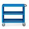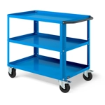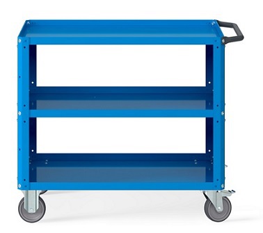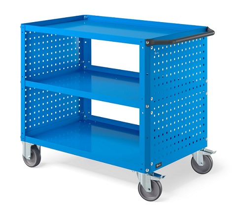 Carrello Clever 1012 LARGE. In lamiera verniciata. Ideale per lo spostamento di materiali, componenti ed utensili. Completo di:n.3 piani in acciaio dotati di bordo rialzato per evitare la caduta del materiale durante il trasporto. Piano centrale regolabile in altezza. Pannelli forati laterali a foro quadro, ideali per l'alloggiamento di accessori Iron Team (non inclusi) per riporre utensili ed attrezzatura. Maniglia su un lato corto. n.4 ruote in gomma antitraccia sintetica. FORNITO SMONTATODisponibile anche nella versione grigio chiaro RAL7035