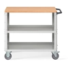Carrello Clever 1013 LARGE. In lamiera verniciata. Ideale per lo spostamento di materiali, componenti ed utensili. Completo di: Piano superiore in legno Multiplex, come base di appoggio e per lavorazioni varie. n.2 piani in acciaio dotati di bordo rialzato per evitare la caduta del materiale durante il trasporto. Piano centrale regolabile in altezza. Pannelli forati laterali a foro quadro, ideali per l'alloggiamento di accessori Iron Team (non inclusi) e ganci Unipok (non inclusi) per riporre utensili ed attrezzatura. Maniglia su un lato corto. n.4 ruote in gomma antitraccia sintetica. FORNITO SMONTATODisponibile anche nella versione blu RAL5012