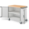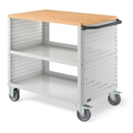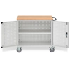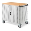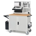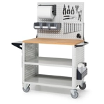 n.1 piano superiore in legno Multiplex n.2 piani con bordo rialzato Piano centrale regolabile in altezza Porte con serratura Pannelli forati laterali e posteriore Maniglia su un lato corto