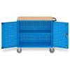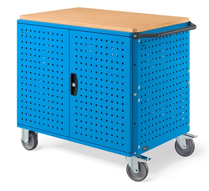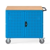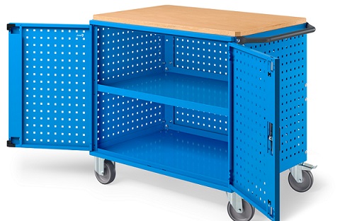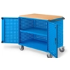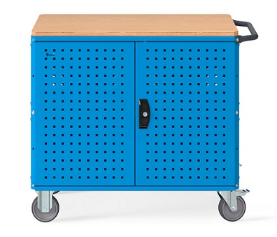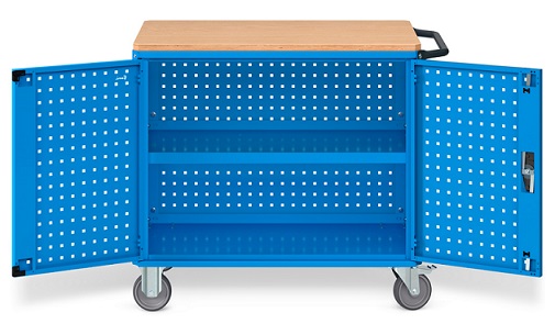 Carrello Clever 1018 LARGE. In lamiera verniciata. Ideale per lo spostamento di materiali, componenti ed utensili. Completo di: Piano superiore in legno Multiplex, come base di appoggio e per lavorazioni varie. n.2 piani in acciaio dotati di bordo rialzato per evitare la caduta del materiale durante il trasporto. Piano centrale regolabile in altezza. Chiuso da 2 porte forate, con serratura a cilindro per la custodia di attrezzature e componenti.Pannelli forati laterali e posteriore a foro quadro, ideali per l'alloggiamento di accessori Iron Team (non inclusi) e ganci Unipok (non inclusi) per riporre utensili ed attrezzatura. Maniglia su un lato corto. n.4 ruote in gomma antitraccia sintetica. FORNITO SMONTATODisponibile anche nella versione grigio chiaro RAL7035