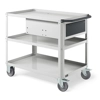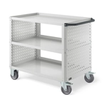 Carrello Clever 1019 LARGE. In lamiera verniciata. Ideale per lo spostamento di materiali, componenti ed utensili. Completo di:n.3 piani in acciaio dotati di bordo rialzato per evitare la caduta del materiale durante il trasporto. Piano centrale regolabile in altezza. n.1 cassetto con serratura a chiave (frontalino in grigio RAL7016). Maniglia su un lato corto.n.4 ruote in gomma antitraccia sintetica. FORNITO SMONTATODisponibile anche nella versione blu RAL5012