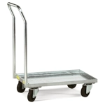 Realizzato in lamiera zincata. Per contenitori Euro Box. Pianale con bordo rialzato per inserire in sicurezza i contenitori in polipropilene Euro Box.Senza maniglia.n. 4 ruote in gomma standard Ø 100 mm.