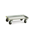 Realizzato in lamiera zincata. Per contenitori Euro Box. Pianale con bordo rialzato per inserire in sicurezza i contenitori in polipropilene Euro Box.Completo di maniglia. n. 4 ruote in gomma standard Ø 100 mm.
