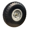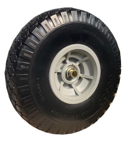 n.2 gomme piene antiforatura ø 250 mm con mozzo in plastica grigia e foro passante con cilindro in ferro, n.2 ruote girevoli direzionali ø 100 mm. e n.2 pararuote.