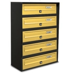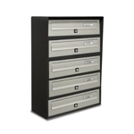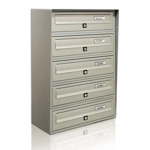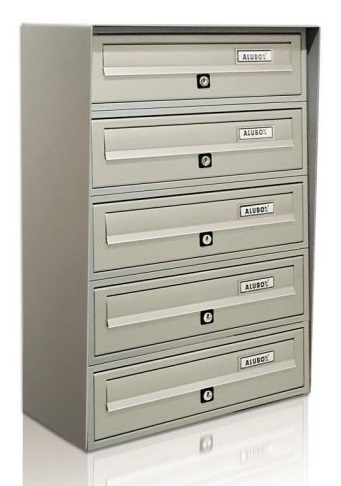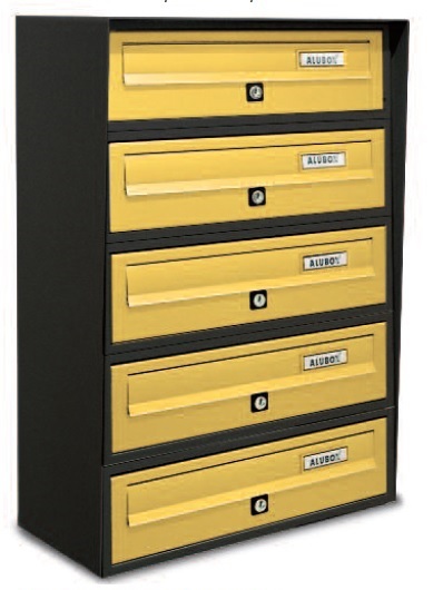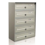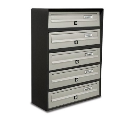Casellario Postale Condominiale Slim 5 Posti - Codice SLIM5X1.Slim è il casellario postale da esterno a 5 posti adatto ad ogni tipo di installazione verniciato alle polveri nel colore argento metallizzato oppure con mantello color antracite.Sportello in profilato di alluminio con sistema antiprelievo.Mantello di rivestimento verniciato alle polveri su entrambe i lati.Per installazione autoportante: necessaria una piantana piccola Codice 10SLIMPIANTPer installazioni particolari a preventivo.I fori per l'installazione a muro sono da realizzare in autonomia come l'acquisto dei tasselli