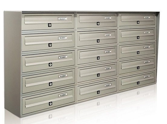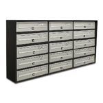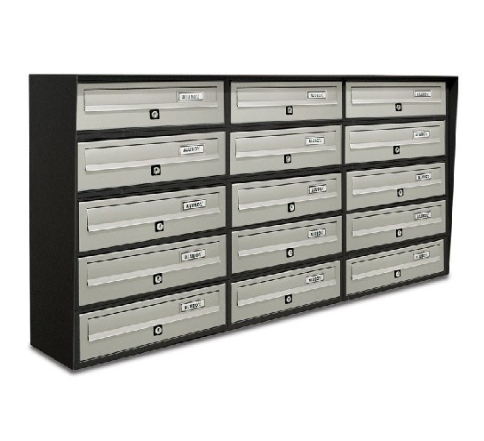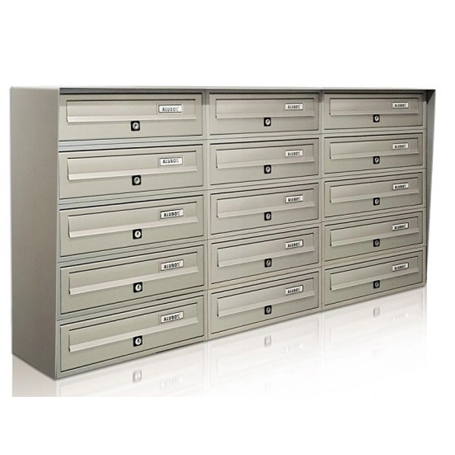 Casellario Postale Condominiale Slim 15 Posti - Codice SLIM5X3.Slim è il casellario postale da esterno a 15 posti adatto ad ogni tipo di installazione verniciato alle polveri nel colore argento metallizzato oppure con mantello color antracite.Sportello in profilato di alluminio con sistema antiprelievo.Mantello di rivestimento verniciato alle polveri su entrambe i lati.Per installazione autoportante: una piantana grande Codice 10SLIMPIANTPer installazioni particolari a preventivo.I fori per l'installazione a muro sono da realizzare in autonomia come l'acquisto dei tasselli