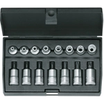 Bussole e giunzioni con attacco quadro da 3/8" (mm 9,52). Assortimenti in cassetta metallica.