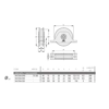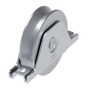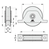 Ruota gola V con supporto interno forato. Con cuscinetti a sfere schermati a tenuta stagna. Materiale acciaio zincato. n.1 cuscinetto Valore diametro esterno nominale. Fissaggio al portone tramite supporto con viti. Dimensioni come da schema.