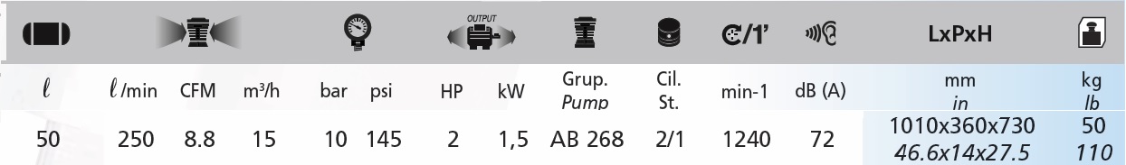 Compressore AB50268M elettrico con trasmissione a cinghia, potente motore a 2 cavalli e serbatoio da 50lt. Idoneo per un uso intensivo sia a livello semi-professionale che professionale. Utile per lavori come la chiodatura, aggraffatura, verniciatura, soffiaggio, gonfiaggio pneumatici, piccola scalpellatura. Meccanica con trasmissione a cinghia tra il motore elettrico e il gruppo pompante con cilindri interamente in ghisa. La trasmissione a cinghia, permette il funzionamento del compressore ad un basso regime di rotazione della testa pompante, con riduzione dell’usura della macchina ed aumento della durata del compressore stesso. La bassa velocità del gruppo pompante, riduce inoltre la temperatura di esercizio e la rumorosità.Caratteristiche: Motore elettrico a induzione, privo di spazzole di sfregamento, che sono i componenti soggetti ad usura, e quindi di massima durata nel tempo e con manutenzione minima.Gruppo pompa monostadio con due cilindri in ghisa. Manopola di regolazione della pressione in uscita, con manometro per la verifica, posto sotto alla manopola stessa, unita ad una uscita.Pressostato che riattiva il compressore automaticamente appena la pressione scende sotto una determinata soglia.Valvola di sicurezza che si attiva in caso di pressione eccessiva nel serbatoio.Griglia di protezione per proteggere la cinghia e la trasmissione da oggetti esterni, che potrebbero causare danni durante il funzionamento. La griglia permette inoltre di tenere sempre sotto controllo la cinghia.Lubrificazione ad olio con spia di controllo alla base del gruppo pompante. Bisogna inserire l'olio prima di metterlo in funzione.Valvola di spurgo posta nella parte sottostante per svuotamento periodico del serbatoio.Trasporto facile grazie alle due ruote posteriori in gomma e alla robusta maniglia anteriore gommata. Assenza totale di perdite d’olio grazie alla particolare forma costruttiva del carter monopezzo brevettato da FIAC.Tamponi antivibranti per la stabilità in funzione.Verniciatura a polvere epossidica a garanzia di una perfetta tenuta nel tempo.
