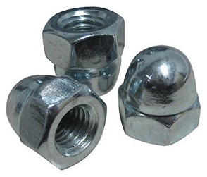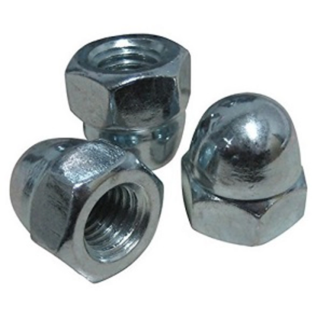 Dadi esagonali ciechi in acciaio classe A2 UNI 5721. Con calotta sferica. Realizzati in acciaio inox. Filettatura metrica ISO a passo grosso. UNI 5721. DIN 1587.