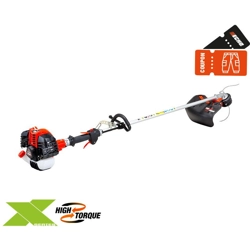 Decespugliatore con sistema High Torque. +Operatività: maggiore superficie tagliata in minor tempo e con minor fatica. +50% di coppia: prestazioni elevate anche in condizioni difficili. +Durata: minore surriscaldamento del motore. Decespugliatore in grado di soddisfare sia il privato che deve gestire ampie aree di lavoro, che i professionisti più esigenti. Grazie al rivoluzionario sistema High Torque offre un'operatività eccezionale con consumi ridotti, peso contenuto e basse vibrazioni. Dal 2012 la Echo ha introdotto nella gamma dei decespugliatori la linea High Torque. Le macchine High Torque montano una coppia conica di nuovissima generazione che è in grado di aumentare le prestazioni del 50% rispetto alle versioni normali, con una maggiore capacità di taglio. La coppia conica è supportata da un maggior numero di cuscinetti di aumentata dimensione. Coppie coniche normali, in fase di sfalcio di erba folta e spessa, portano ad una diminuzione dei giri del motore, ad una diminuzione dei giri del volano, con conseguente surriscaldamento del gruppo termico e rischio di annerimento del pistone, di incollaggio delle fasce e di grippaggio. Tutto questo arriva ad intaccare anche il carburatore con perdita prestazionale.Le coppie coniche High Torque evitano tutto questo, e mantengono il motore ad un regime di giri più elevato, con conseguente combustione ottimale e riduzione dei consumi di carburante.La superiore capacità di taglio offerta dai modelli High Torque, permette di lavorare con una lunghezza utile di filo superiore e una testina più capiente, andando così a ridurre i tempi morti per la ricarica del filo. Rispetta le normative EURO2 in materia di emissioni.I decespugliatori ECHO sono caratterizzati da una lunga durata, da manovrabilità, robustezza, forza, bilanciamento e da basse vibrazioni; riescono ad essere leggeri e potenti allo stesso tempo. Un altro elemento che caratterizza i prodotti ECHO è la marmitta a basso rumore, in grado di dare all'utilizzatore soddisfazione e comfort nell'utilizzo.Caratteristiche Tecniche Rapporto ingranaggi e lubrificante: 2,07 riduzione e grasso al litio di buona qualità.Senso di rotazione dell'alberino di uscita visto dall'alto: senso antiorario.Dotato di:-primer per avvio facilitato-sistema antivibrante-blocco acceleratore-tappo miscela laterale-marmitta a basso rumore