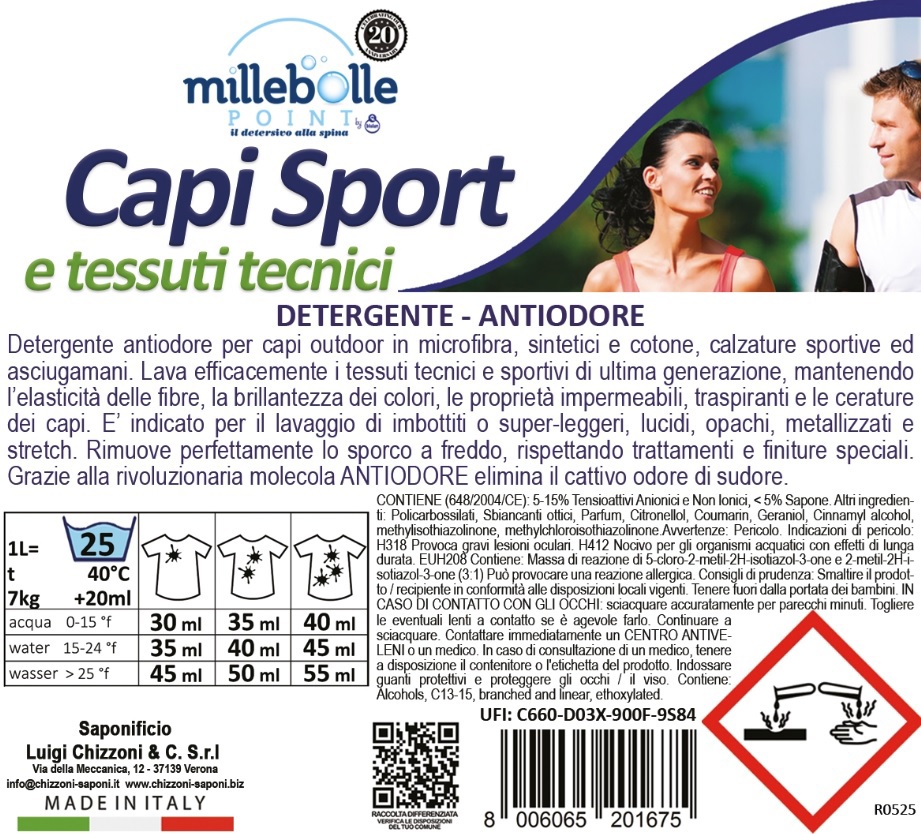 Lava efficacemente i tessuti tecnici e sportivi di ultima generazione, mantenendo l'elasticità delle fibre, la brillantezza dei colori, le proprietà impermeabili, traspiranti e le cerature dei capi.