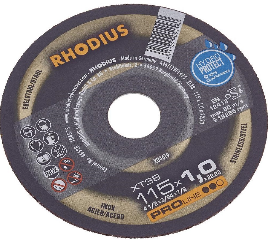 Disco Rhodius da taglio 115x1,0x22,23 - XT38 - 204619 - Serie ProLine.Velocità max 80 m/sVelocità max 13285 giri/min.Spessore 1,0-1,9 mm