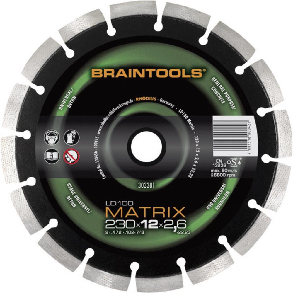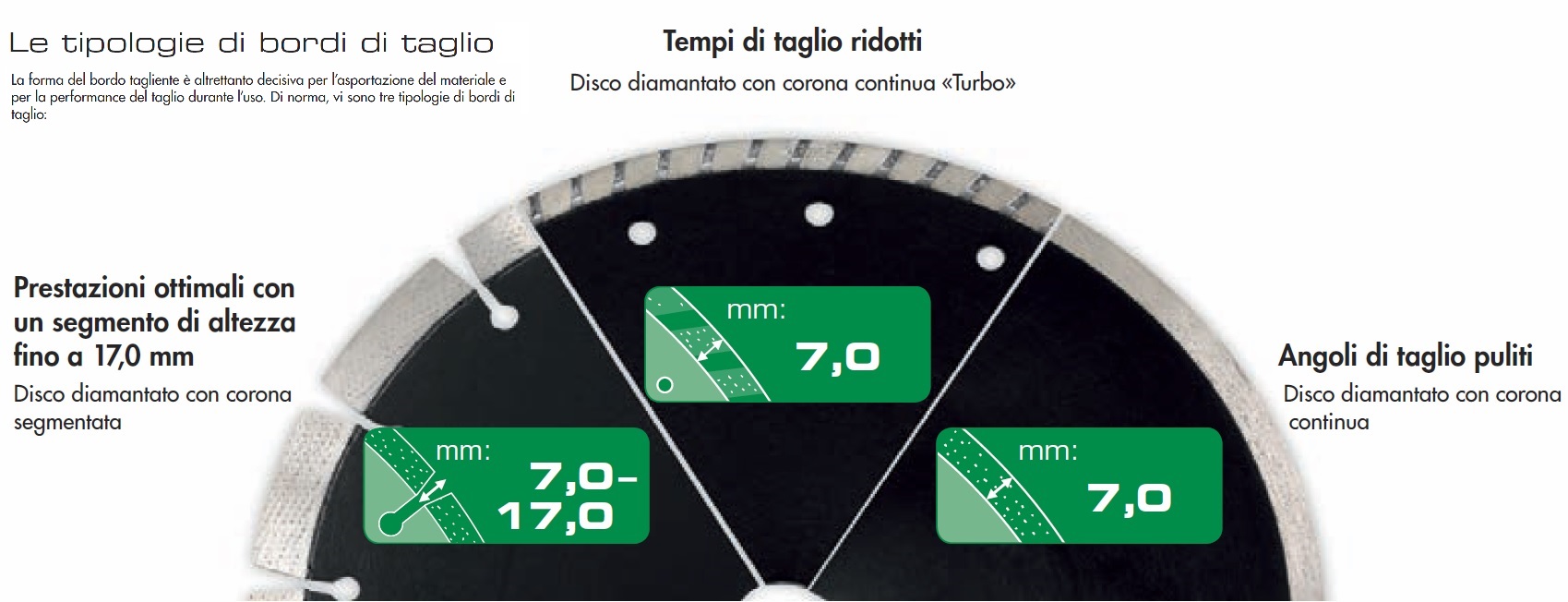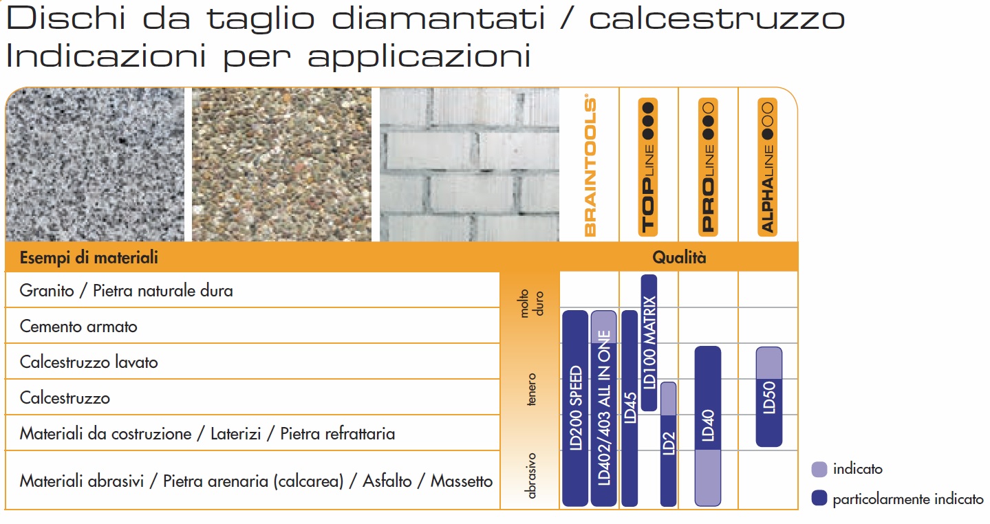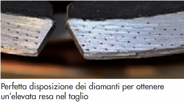 Disco Rhodius diamantato calcestruzzo da 230x12,0x2,6 - LD100 MATRIX - 303381. Serie TopLine Velocità 80 m/s. Materiale Granito / Pietra naturale dura Cemento armato Calcestruzzo lavato Calcestruzzo Informazioni generali Da un disco diamantato gli utilizzatori professionali si attendono un taglio veloce e una lunga durata, sia che si lavori sulla pietra naturale, sulle piastrelle, sul calcestruzzo o sull'asfalto. La performance del disco diamantato nell'impiego pratico dipende sostanzialmente da tre fattori: la qualità dei diamanti, la durezza del legante e la forma del bordo di taglio. I diamanti di produzione industriale di alta qualità ci consentono di offrire dischi diamantati dalle caratteristiche ottimali. Vengono prodotti in grafite sotto elevata pressione e ad alte temperature. Pertanto, a differenza dei diamanti naturali, le proprietà tipiche sono riproducibili in qualsiasi momento. Non esistono dischi da taglio diamantati universali ed utilizzabili per qualsiasi tipo di applicazione. Il materiale su cui lavorare è determinante per la scelta del disco diamantato ideale. I seguenti dettagli rivestono la massima importanza durante l'impiego dei dischi diamantatiPurezza Grado di durezza Affilatura dei bordi Geometria costante Il segmento legante I diamanti presenti nel disco da taglio diamantato sono integrati sul segmento mediante un legante metallico.La composizione della polvere metallica che costituisce il legante viene selezionata in base all'utilizzo del disco da taglio. Quando si devono tagliare materiali di costruzione abrasivi, è necessario selezionare un segmento rigido. Nel caso in cui il disco da taglio sia destinato a materiali rigidi, un legante morbido sarà la scelta più idonea. Le diverse proprietà del legante influenzano pertanto le capacità di taglio e l'usura del segmento. Le tipologie di bordi di taglio La forma del bordo tagliente è altrettanto decisiva per l'asportazione del materiale e per la performance del taglio durante l'uso. Di norma, vi sono tre tipologie di bordi di taglio.