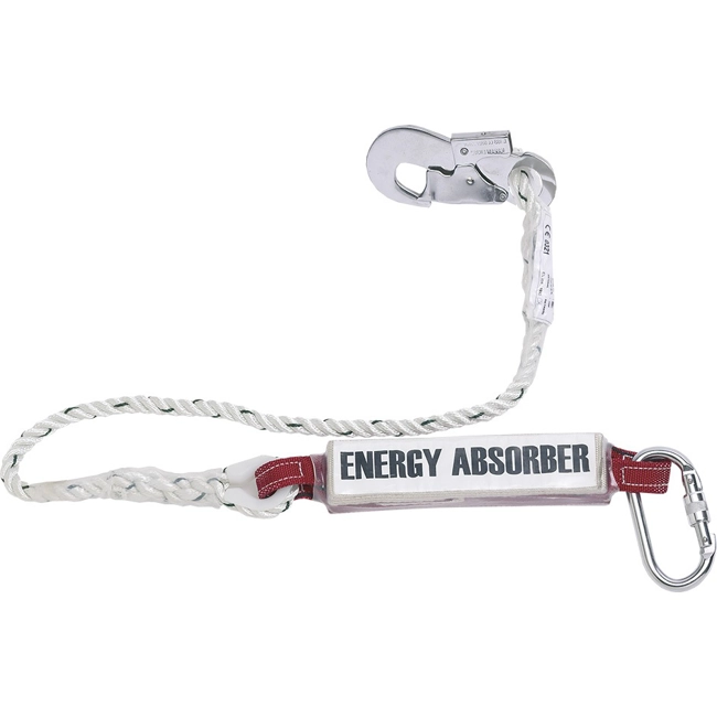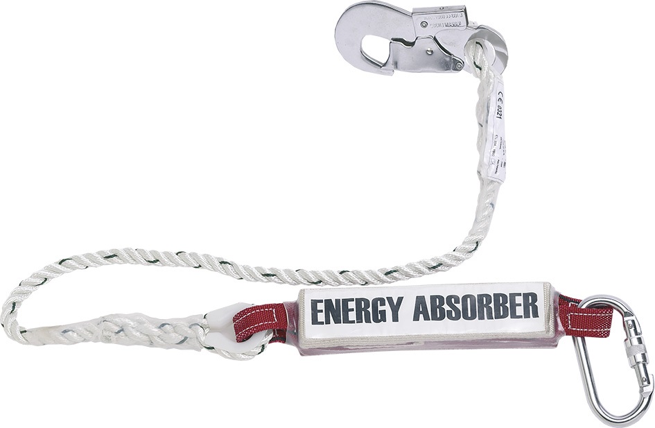 Cordino con dissipatore di energia, fornito di un gancio ed un moschettone, linea Akrobat. Nota Verificare che tra il punto di ancoraggio ed il suolo o piano di rischio caduta, ci siano almeno 6 metri.