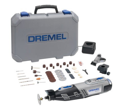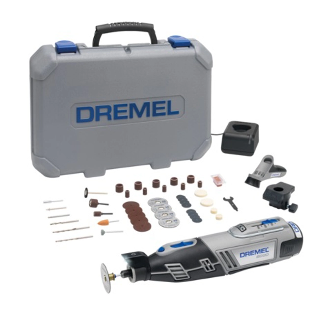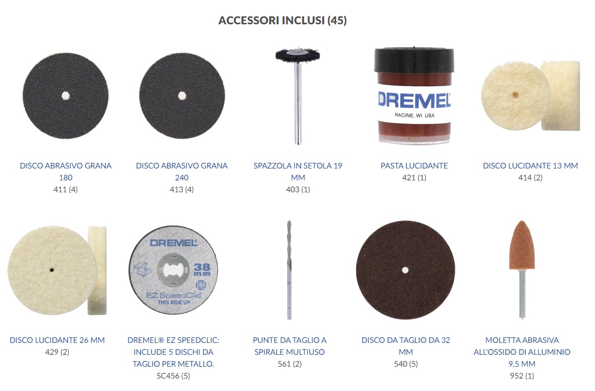 Multiutensile a batteria funzionante con una batteria al litio da 12V e potente come un multiutensile a filo. Per lavorare in casa o fuori casa senza il vincolo del cavo. Dal taglio alla smerigliatura, alla levigatura e alla lucidatura con la massima precisione. Luce LED che migliora la visibilità e consente anche di lavorare in zone buie. Freno motore che arresta la rotazione dell'accessorio immediatamente allo spegnimento dell'utensile. Ciò consente di poggiarlo subito dopo l'uso e procedere con il passo successivo del vostro progetto. Chiave integrata nel cappuccio EZ Twist che permette di risparmiare tempo per il cambio degli accessori intercambiabili. Si passa dal grezzo al fine per una finitura perfetta e particolareggiata.Completo di: n.1 Supporto a 45° e 90° (art.576). Permette di utilizzare il multiutensile Dremel a un angolo di 45° o 90° per maggiore precisione nei lavori di levigatura, affilatura o smerigliatura.Ideale per rifinire un taglio con il nastro abrasivo a grana 60 incluso e l'accessorio perno (407).Ottimo per affilare e modellare l'attrezzatura da giardino, come le cesoie, ad un angolo pulito di 45° utilizzando l'accessorio molettina abrasiva (932) incluso.Si utilizza inserendo e fissando l'accessorio in dotazione e avvitando senza fatica il supporto a 45° e 90°. Si procede poi a regolare il supporto fino a 20 mm., serrare e creare l'angolo perfetto di 45°/90° mantenendolo appoggiato al pezzo in lavorazione.n.1 Impugnatura di dettaglio (art.577). Permette di impugnare il multiutensile come fosse una penna, per un utilizzo ancora più facilitato. n.45 accessori. Accessori con sistema di cambio veloce EZ Twist.