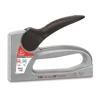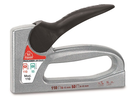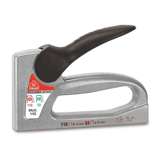 Fissatrice manuale modello ROCAMA JR DUO 110 - Codice 0101027. Per punti metallici. La fissatrice è dotata di un’ampia zona di appoggio e di piedini posteriori che garantiscono la massima stabilità. Maniglia composta da 2 elementi; la struttura in acciaio indurito è ricoperto in resina poliuretanica studiata per ottenere la massima ergonomia ed un ottima impugnabilità in fase di utilizzo con minimo sforzo. Infigge completamente il punto 110 e 53/10 mm. in legno di media durezza. Elemento elastico: n.2 balestre in acciaio speciale trattato, la cui sagoma è stata studiata per avere la massima capacità di infissione con il minimo sforzo sulla maniglia. Disinceppo: la spinta elastica del carrello contro il frontale riduce gli inceppi. In caso di inceppo pesante, il carrello si sgancia e le parti interessate non vengono danneggiate.