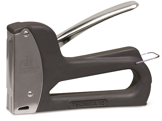 Fissatrice manuale modello TECNICA 10 MOD.110 - Codice 0113086. Per punti metallici. Leggera e molto compatta. L'ampia superficie d'appoggio sul piano di lavoro garantisce un'ottima stabilità ed evita spostamenti durante l'azionamento. Lo sforzo della mano è ridotto rispetto alla notevole capacità di infissione del punto e risulta meno stancante delle fissatrici concorrenti, grazie ai criteri ergonomici adottati. Infigge completamente il punto 110 nel legno di media durezza. Elemento elastico: balestra a 3 fogli d'acciaio speciale trattato. Disinceppo: la spinta elastica del carrello contro il frontale riduce considerevolmente la possibilità di inceppo. In caso di inceppo pesante, il carrello si sgancia e le parti interessate non vengono danneggiate.