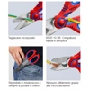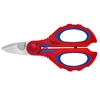 Forbici da elettricista - Articolo Knipex 950510SB. Cesoia universale per elettricisti. Caratteristiche Taglienti rettificati con dentatura fine per un taglio netto senza slittamento.Tagliente con cesoia per cavo.Tasca in materiale sintetico per cintura. Manici rivestiti in materiale bicomponente, rinforzato in fibra di vetro.Con punto di crimpaggio per terminali a bussola fino a 6,0 mm².Taglienti in acciaio inossidabile, durezza dei taglienti 56 HRC.