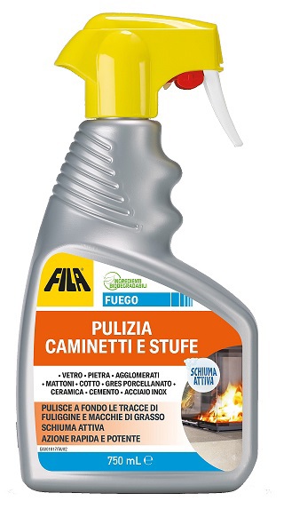Schiuma spray detergente rimuovi fuliggine, specifica per la pulizia di vetri e rivestimenti di stufe e camini.