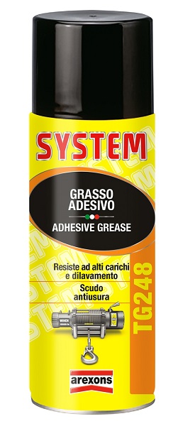 GRASSO ADESIVO SYSTEM TG248 400 ml - Codice AX4248.Prodotto specifico per la lubrificazione di catene di trasmissione e ingranaggi scoperti di impianti ed attrezzature, di montacarichi, di montaggio, macchinari per imballaggio, nastri trasportatori, ruote dentate, aste e cerniere, asfaltatrici, perforatrici, spazzatrici stradali, cesoie e presse, verricelli. Lubrificante minerale contenente additivi E.P. (estrema pressione). Penetra e raggiunge i punti più inaccessibili degli ingranaggi eliminando l'inconveniente di zone scoperte ed assicurando una lubrificazione al 100%. Non secca. Forma uno scudo antiusura che protegge dalla corrosione.Possiede elevata adesività, elevata resistenza al carico, formando un film estremamente tenace per alte pressioni. Resiste al dilavamento, alla temperatura ed alla centrifugazione.CaratteristicheAspetto Liquido viscoso Colore paglierino Odore caratteristico Peso specifico kg/l 0,690 Propellente Propano - butano Temperature di esercizio °C Da -20 a +120