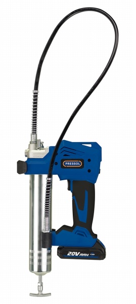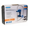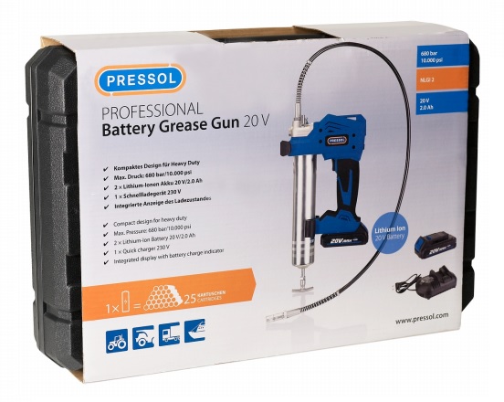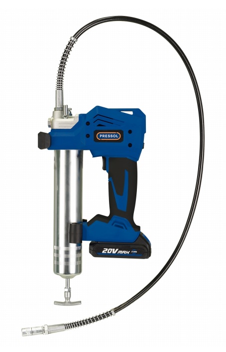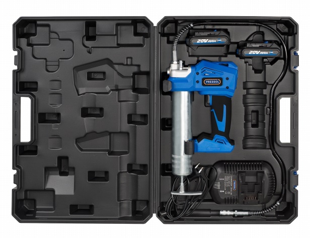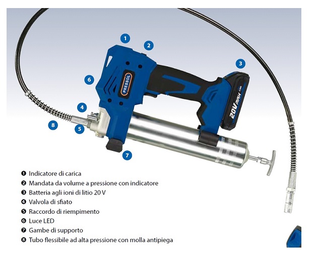 Ingrassatore professionale a batteria 20V - 2 Ah.- art.18051. Nuova pistola ingrassatrice a batteria, robusta e con design ergonomico. Con incredibile carico di lavoro. SpecificheMotore elettrico a batteria da 20V. Tubo flessibile alta pressione 11x1000 mm., ugello antigoccia. Ingrassatore zincato. Lavora con grassi fino a NLGI 2 a 20°C. Stantuffo con guarnizione anulare per grasso sfuso o cartuccia. Con punto di ingrassaggio e valvola di sfiato. 2 velocità regolabili di trasporto del grasso. Lo stato di carica della batteria viene visualizzato sull'ingrassatore e sulla batteria. Impugnatura morbida. Display integrato con indicatore di carica della batteria. Mandata regolabile da volume a pressione. La batteria agli ioni di litio 20V-2Ah può svuotare fino a 25 cartucce per carica della batteria. Con contropressione di 100 bar fino a 7 cartucce. Sfiato tramite valvola di sfiato o mediante mezzo giro della testa. Riempimento tramite raccordo di riempimento. La luce a LED illumina l'area di lavoro per aiutare a identificare i nippli di ingrassaggio in ambienti scarsamente illuminati e accessi ristretti. Gambe di supporto per una facile maneggevolezza, tenuta stabile. Molla antipiega che evita delle pieghe nel tubo e che prolunga la durata.