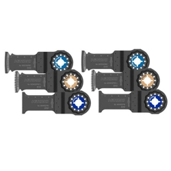 Il kit è composto da: n.1 lama per legno rif.MSW32PCAttacco universale starlockLarghezza 32 mm. Profondità di taglio 50 mm. Spessore 0,6 mm. Passo dente 18 TPI 1,4 mm. Indicata per il taglio di sandwich, pannelli in legno, laminati. n.2 lame per metallo rif.MSM32PB Attacco universale starlockLarghezza 32 mm. Profondità di taglio 50 mm. Spessore 0,7 mm. Passo dente 20 TPI 1,3 mm. Indicata per il taglio di metalli, metalli non ferrosi, telai metallici. n.2 lame per legno + metallo rif.MSD32PBC Attacco universale starlockLarghezza 32 mm. Profondità di taglio 50 mm. Spessore 0,6 mm. Passo dente 20 TPI 1,3 mm. Indicata per il taglio di legno con chiodi, legno, sandwich, plastica.