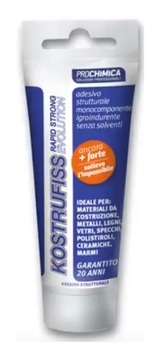 Kostrufiss Rapid Strong Evolution è un adesivo monocomponente, per incollaggi strutturali permanenti, senza solventi. Indurisce in presenza di umidità nell'aria oppure nell'umido residuo del materiale di base. Kostrufiss Rapid Strong Evolution è formulato con delle nuove resine e reso tixotropico grazie ad un procedimento innovativo; indurisce rapidamente, non cola, si può applicare anche in verticale ed è sovraverniciabile e levigabile. Per le sue specifiche caratteristiche è un collante, inodore, indispensabile per costruzioni in metallo o in legno con insuperabile resistenza all'acqua, alle temperature e agli agenti atmosferici. Produce un effetto riempitivo offrendo incollaggi fortissimi anche su superfici sconnesse. E' inattaccabile dai microrganismi e dai solventi in genere. Resiste agli acidi, oli e raggi UV con effetto antiacustico assorbendone le vibrazioni. Applicazioni Per incollare pannelli, perimetri di barche, davanzali, strisce, soglie, specchi e materiali isolanti. Rappresenta la più alta tecnologia per le costruzioni navali, di serramenti, scale, carpenterie, saune, muratura, cemento, parquet, metalli, ceramica, vetro, specchi, polistirolo, polistirene, gomma, plastica, etc. E' in grado di incollare, in genere, qualsiasi materiale che liberi umidità. E' ideale per incollare metalli, legno, cemento, ceramica, marmo, vetro, specchi, gomma, e molti materiali plastici (con esclusione di: polipropilene, polietilene, teflon) in generale qualsiasi materiale in grado di liberare umidità. Incolla e sigilla i profili di alluminio aumentando il bloccaggio degli angoli dei serramenti (squadra, tubolare) assicurando la massima tenuta sia ai carichi di sfilamento che a tutte le forze di indebolimento del punto di finitura dei serramenti. E' sufficiente applicare Kostrufiss Rapid Strong Evolution solo su un lato distribuendolo a forma di corda oppure a tratti o, se necessario, con una spatola dentata. per ottenere un incollaggio dell'adesivo più veloce, senza dipendere dai cambiamenti di umidità naturali. L'indurimento avviene per reazione con l'umidità che comporta il formarsi di minime quantità di C02, e quindi il volume del collante aumenta leggermente. E' inodore e indurisce rapidamente. Resistente all'acqua, agli agenti atmosferici e in ambienti marini. Non cola in posizione verticale.Conformità DIN EN 204 da resistenza al calore in base al DIN EN 14257 (WATT 91) c.a. 8,7 N/mm².