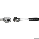 In acciaio CROMO-VANADIO. Leva a cricco COMBINATA, REVERSIBILE, A DOPPIA TESTA con attacco esagonale femmina 1/4" per bits con levetta per movimento D+S da una parte e attacco quadro maschio 1/4" per bussole con levetta per movimento D+S dall'altra.