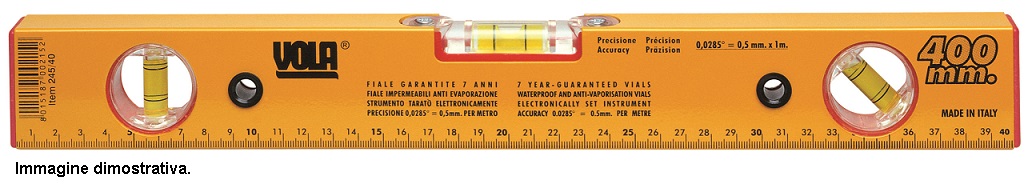 Livella in profilato di alluminio verniciato di colore giallo (RAL 1007) - Art. 245. n.3 fiale. Fiala centrale regolabile con viti. Fiale a blocco in acrilico infrangibile con lente di ingrandimento (+60%). Migliore leggibilità in caso di scarsa luminosità, grazie ad un rivestimento fluorescente ottimizzato.