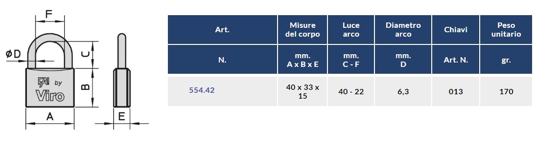 Lucchetto rettangolare ad arco lungo Fai by Viro - codice Viro 554.42. La vasta gamma disponibile, il profilo chiave Viro, l'ammaestrabilità delle misure più diffuse e l'esistenza di un articolo idoneo ad essere messo a sistema con i cilindri della serie 900, rendono i lucchetti Fai by Viro adatti a soddisfare molteplici esigenze. CaratteristicheCorpo in ottone massiccio satinato, con spigoli smussati antiabrasione. Arco in acciaio cementato e temprato per una grande resistenza al taglio, ramato, nichelato e cromato per una grande resistenza alla corrosione. Chiavi in ottone nichelato, a profilo Viro, 2 in dotazione. Meccanismo:Chiusura a scatto.Chiave estraibile sia a lucchetto chiuso che aperto.Pistoncini in ottone.Contropistoncini in ottone. n.2 scrocchi molleggiati in ottone. Molle pistoncini in bronzo fosforoso.Molle scrocchi in acciaio armonico classe D.Molla arco in acciaio armonico classe D.