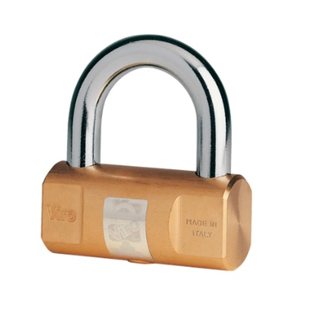 Lucchetto cilindrico - Codice Viro 104. La caratteristica forma cilindrica lo rende sicuro e resistente, ma anche esteticamente unico. L'affidabilità della "Serie 100" è garantita da due scrocchi, non in asse, per impedire lo strappo dell'arco. Un ologramma Viro sul corpo del lucchetto (serie 100) contrasta le possibili imitazioni. CaratteristicheCorpo in ottone massiccio, satinato e protetto da vernice trasparente, con spigoli smussati antiabrasione. Arco in acciaio cementato e temprato per una grande resistenza al taglio, ramato, nichelato e cromato per una grande resistenza alla corrosione. Chiavi in ottone nichelato, a profilo Viro, 2 in dotazione. Meccanismo:Chiusura a scatto.Chiave estraibile solo a lucchetto chiuso.Pistoncini in ottone.Contropistoncini in ottone "a fungo" contro l'azione del grimaldello.Pistoncino di sicurezza contro lo scasso.2 scrocchi molleggiati in acciaio cementato, temprato e nichelato.Molle pistoncini in bronzo fosforoso.Molle scrocchi in acciaio armonico classe D.Molla arco in acciaio armonico classe D. UNI EN 12320
