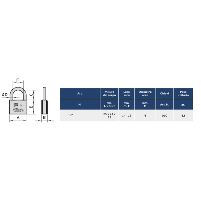 Lucchetto rettangolare Fai by Viro - Codice Viro 552. La vasta gamma disponibile, il profilo chiave Viro, l'ammaestrabilità delle misure più diffuse e l'esistenza di un articolo idoneo ad essere messo a sistema con i cilindri della serie 900, rendono i lucchetti Fai by Viro adatti a soddisfare molteplici esigenze. CaratteristicheCorpo in ottone massiccio satinato, con spigoli smussati antiabrasione. Arco in acciaio cementato e temprato per una grande resistenza al taglio, ramato, nichelato e cromato per una grande resistenza alla corrosione. Chiavi in ottone nichelato, a profilo Viro, 2 in dotazione. Meccanismo: Chiusura a scatto.Chiave estraibile sia a lucchetto chiuso che aperto.Pistoncini in ottone.Contropistoncini in ottone.Molle pistoncini in bronzo fosforoso.Molle scrocchi in acciaio armonico classe D.Molla arco in acciaio armonico classe D.