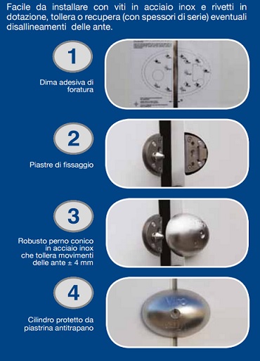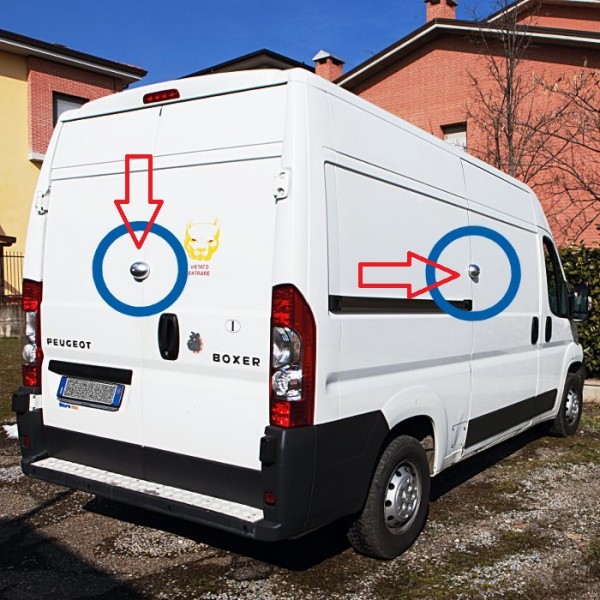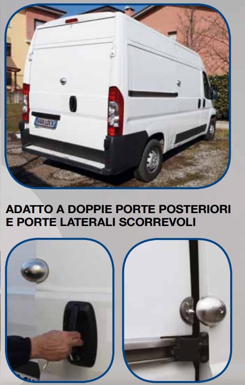 Corpo che si aggancia ad incastro sulla piastra di ancoraggio trapezoidale e si fissa con 2 viti in acciaio inox (in dotazione) dall’interno del vano di carico.2 Piastre di ancoraggio: la prima a mezzaluna con robusto perno conico in acciaio inox che si fissa, con 2 bulloni in acciaio inox e 2 rivetti (in dotazione), sull’anta che fa da battuta (nelle porte posteriori); o sulla parte fissa sul fianco del vano di carico (nelle porte laterali scorrevoli);l’altra di forma trapezoidale in acciaio inox che si fissa, con 2 bulloni in acciaio inox e 2 rivetti (in dotazione), sull’anta che va a battuta (nelle porte posteriori); o sulla porta laterale scorrevole del vano di carico.Meccanismo:chiave estraibile solo con "Van Lock" chiuso;possibilità di mantenere "Van Lock" in stato "sempre aperto" con la chiave inserita e completamente ruotata;pistoncini in ottone;contropistoncini in ottone "a fungo" contro l’azione del grimaldello;molle pistoncini in acciaio inox;protezione copri serratura, contro l’aggressione degli agenti atmosferici;dispositivo di sblocco di emergenza dall’interno (praticamente impossibile da agganciare dall’esterno con strumenti da scasso), nel caso l’operatore rimanga accidentalmente chiuso nel vano di carico.Fornito con:piastre di ancoraggio;viti, bulloni, rondelle in acciaio inox e rivetti;dima adesiva di foratura;spessori in acciaio inox (ordinabili anche singolarmente) per recupero di eventuali disallineamenti fra le ante;guarnizione in gomma antigraffio.Confezione: scatola individuale.