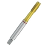 Maschi a macchina HSS+5%Co Quartz fori passanti - articolo Carmon M502. Per acciai tenaci. Inclinazione elica 0°. Per fori passanti. Angolo del dente 60%. Filettatura metrica passo grosso. Tolleranza 6H (ISO DIN13). Finitura: Quartz. L' HSS, High Speed Steel, cioè acciaio rapido, è il più utilizzato tra tutti gli acciai legati per la realizzazione di maschi per metalli. Sono, infatti, acciai in grado di filettare i metalli a velocità di lavoro elevate senza perdere le loro caratteristiche di durezza. L'aggiunta di una percentuale di cobalto alla sua composizione (acciaio super rapido HSS-Co) rende questi maschi particolarmente resistenti alle alte temperature, senza comprometterne la tenacità e la resistenza all'usura. Il particolare rivestimento QUARTZ in TiN (nitruro di titanio) conferisce una maggior durezza che si traduce in maggiore velocita' di rotazione e di avanzamento. Trova applicazione per una vasta gamma di materiali: acciaio comune, acciaio inox, ghisa, titanio, rame, ottone, bronzo, nichel, alluminio.Si consiglia sempre di ridurre la velocità di rotazione e di avanzamento in base all'elevata durezza del materiale e di tenere lubrificata la punta durante la filettatura.Normativa DIN 376.