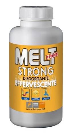 Melt Strong disgorgante effervescente in polvere - Codice 1YCMiscela di alcalini e acceleranti, in grado di liberare blocchi e ingorghi anche importanti.Melt Strong è fra i più potenti ed efficaci disgorganti (non acidi) in commercio.Grazie al calore sviluppato, riesce a scongelare tubazioni congelate dal freddo.Sicuro per le tubazioni in plastica approvate, PVC, etc. Può danneggiare oggetti anodizzati, alluminio, ceramiche fini, cristalli. Può scolorire la griglia dei lavelli; se si deve utilizzare in lavelli con griglia, la polvere deve essere rapidamenterisciacquata nello scarico al fine di evitare lo scolorimento. Scioglie grassi, residui saponosi, residui animali e vegetali, capelli, etc.