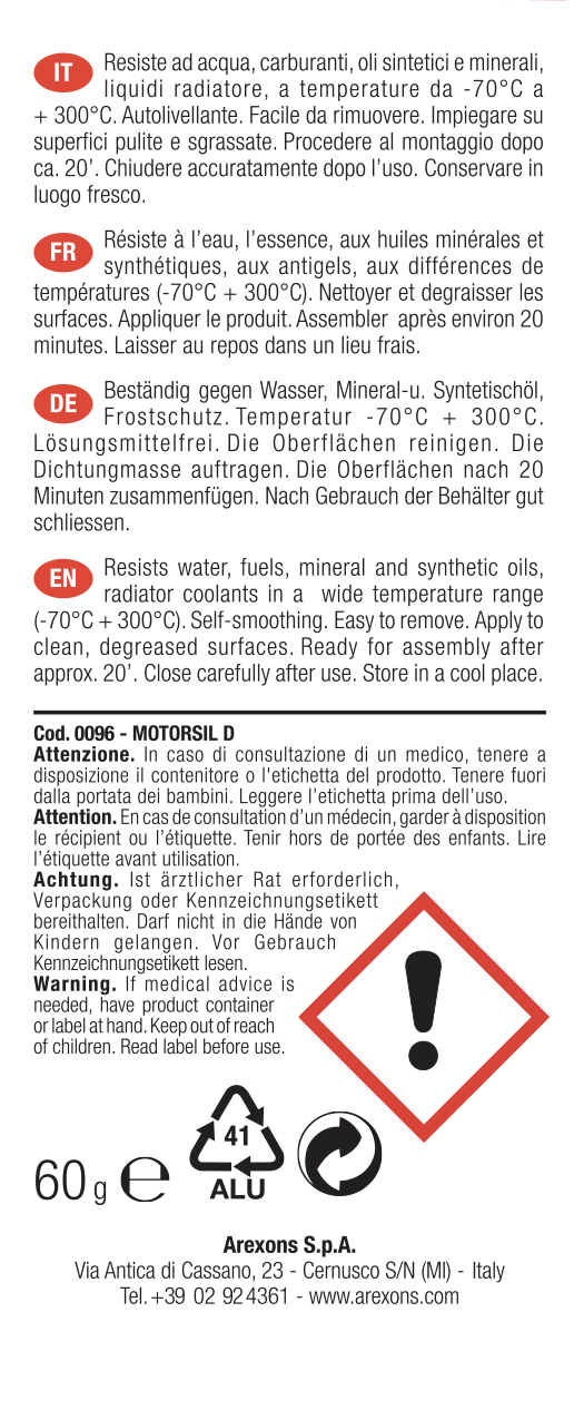Motorsil rosso 60 gr guarnizione siliconica per coppa olio Codice: 0096.Motorsil D è un prodotto per guarnizioni di tenuta, forma una guarnizione di qualsivoglia spessore. Consente di formare accoppiamenti dinamici ed elastici, riempie microspazi dovuti alle non perfette planarità sostituendo tutti i tipi di guarnizioni preformate. Elastomero monocomponente di tipo acetico. Vulcanizza a temperatura ambiente. Buona resistenza alla temperatura, all'acqua, all'umidità. Ottima resistenza agli oli. Buone proprietà dielettriche. Ottima resistenza allo strappo. Elevato grado di assorbimento delle vibrazioni. Buona resistenza alle sollecitazioni meccaniche.Non danneggia le marmitte catalitiche. Facile da rimuovere.Il prodotto, dopo reticolazione, resiste ad acqua, carburanti, oli minerali e sintetici, liquidi per radiatori.