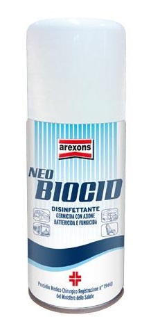 Neo Biocid - Disinfettante Germicida. Neo Biocid è un disinfettante e deodorante spray al profumo di menta studiato per la disinfezione di abitacoli e condotti di condizionamento di automobili, camion, autobus, minivan, camper e roulotte, grazie alla modalità d'uso a svuotamento totale. Adatto anche alla disinfezione di piccole superfici, sale da degenza, ambulatori, aule scolastiche e uffici (modalità ad erogazione manuale). Il prodotto non macchia. La formula del Neo Biocid è depositata presso il Ministero della Salute come Presidio Medico Chirurgico N° di registrazione 19440.